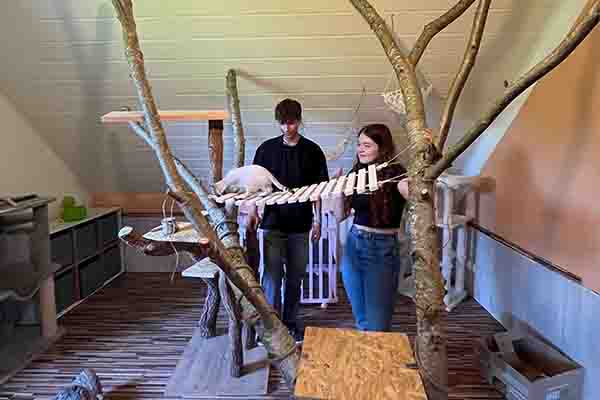 Um den ökologischen Aspekt mit in unser Praktikum hineinzubringen, haben wir zusammen mit dem Ethan einen super riesigen und einzigartigen Katzenbaum gesägt, gebaut und diesen mit viel Muskelkraft in den Katzenraum hochgetragen. Das heißt wir haben vollen Körper Einsatz gezeigt und durften lernen wie man mit einer Säge umgeht, also nehmt euch in acht und passt auf eure Umgebung auf, bevor ihr so ein Projekt startet. Um den kleinen ein großes Katzenparadies zu bieten und es für sie nicht auf Dauer zu langweilig wird, fehlten noch ein paar Spielzeuge die wir angehangen haben. Jetzt springen die Katzen munter und fröhlich auf unseren Spielplatz herum und entdecken jeden Tag was Neues!